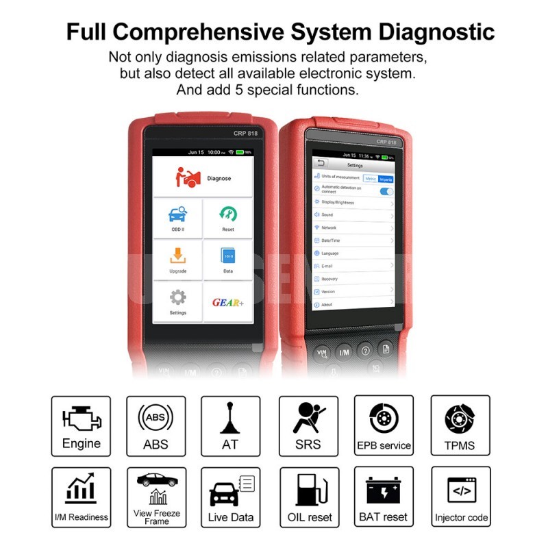 Launch CRP818 is latest designed professional automotive equipment released by Launch tech, based on Andriod system, Wifi communication, vast car model coverage, powerful test function, more special function, more accurate test data,internet remote diagnosis etc.full-system OBD diagnostic function,read &clear DTCs, read data streams,and 5 important reset functioons. For car repairing engineer,but also for car owner DIY